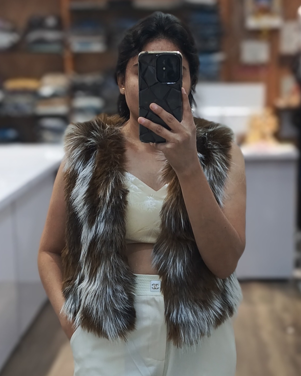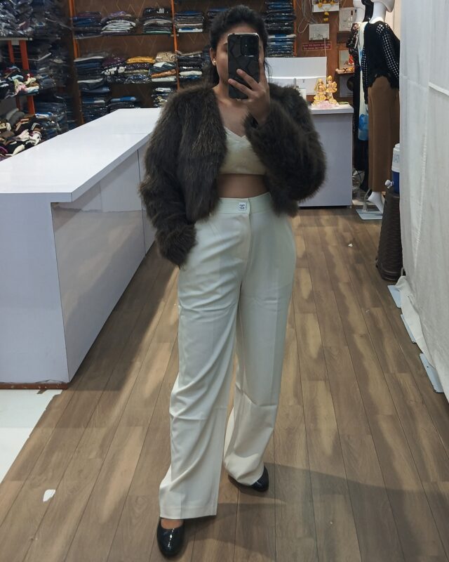 Women Cream Crop Top with White Trousers & Black Fur Top | Party Cord Set