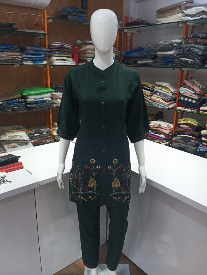Elegant women’s kurta set in a Rich Dark Green shade blends tradition with modern style. The straight-fit kurta features a mandarin collar and button-down front, offering a sophisticated appeal. Intricate multicolor embroidery with floral and tree motifs enhances the hemline and sleeves, adding a unique handcrafted charm. The matching pants also feature embroidery at the ankle, giving the set a coordinated and graceful look. Ideal for casual outings, office wear, or festive occasions, this kurta set provides both comfort and elegance with its fine detailing and versatile design.
