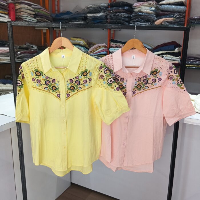 Stylish women’s cotton shirts in pastel shades with floral embroidery on the shoulders.